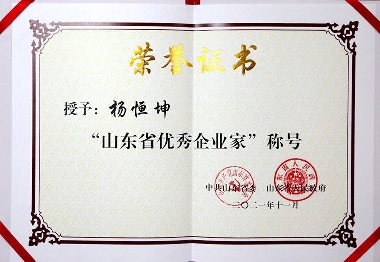 杨恒坤董事长被授予“山东省优秀企业家”称号
